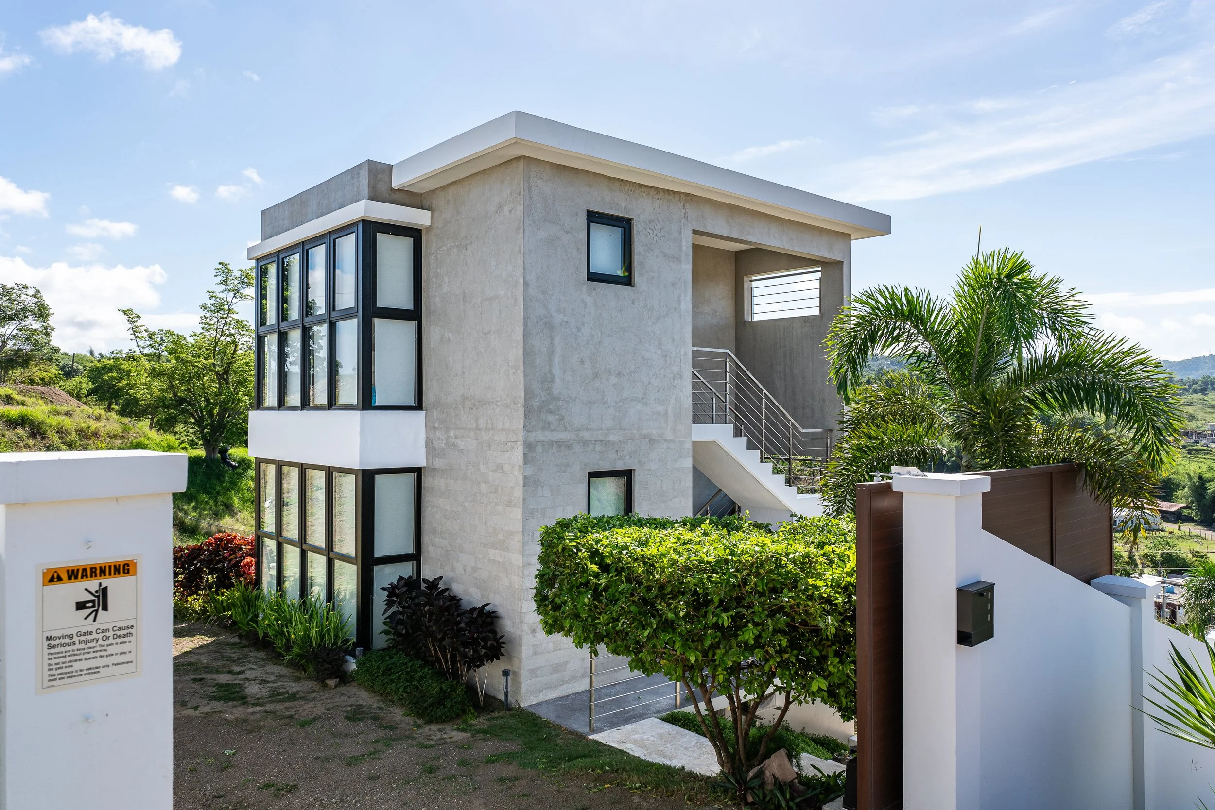 La Casita in Rincon features outdoor spaces defined by concrete walls and durable materials like metal. Inside, a unique three-story staircase leads to guest and master bedrooms with an open kitchen, dining, and living area on the second floor with wood and white accents against microcement elements.